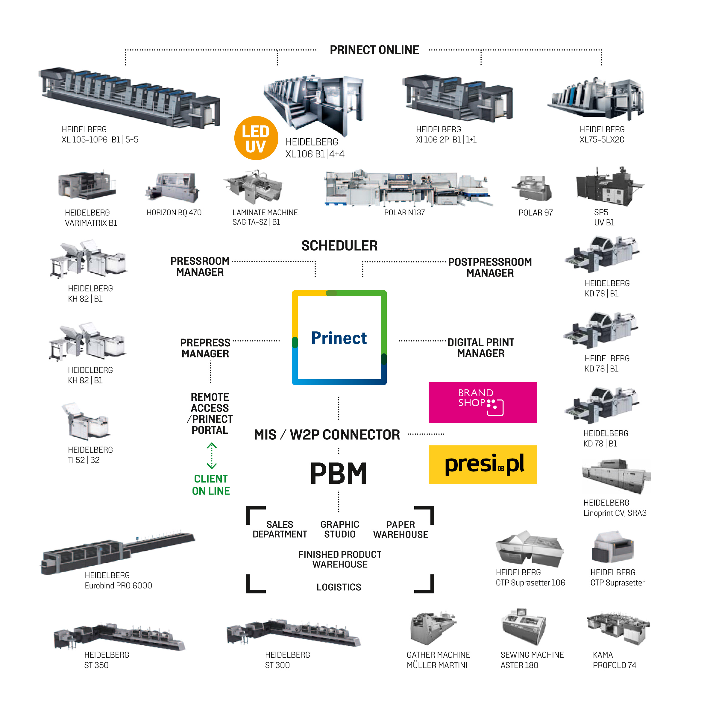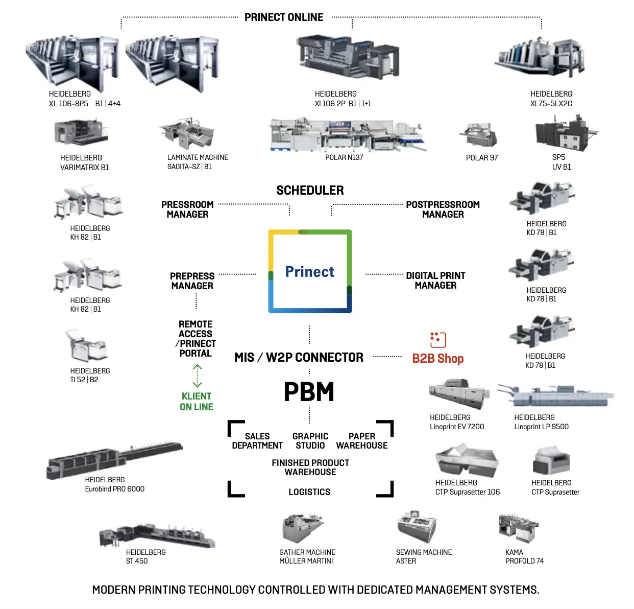 Nad funkcjonowaniem produkcji panujemy dzięki systemowi PRINECT firmy HEIDELBERG. Dzięki temu planujemy produkcję i koordynujemy ją, a Ty masz z nami kontakt poprzez Prinect Portal. Wszystko to dla Twojego spokoju.